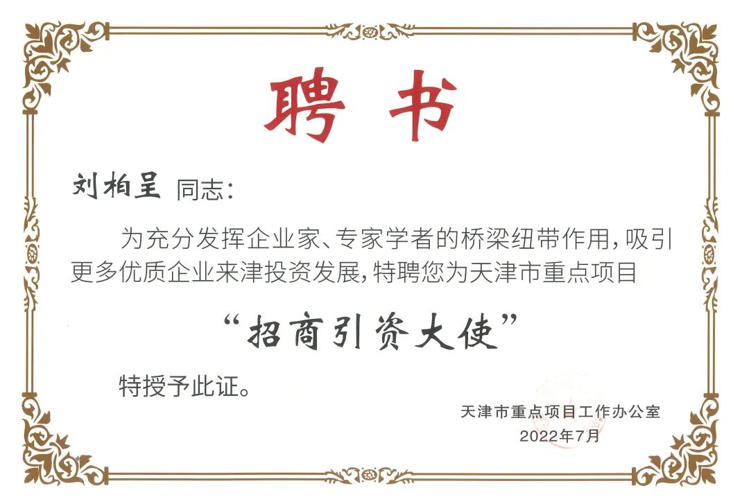 近日,为充分发挥企业家、专家学者的桥梁纽带作用,吸引更多优质企业家来津投资发展,市发改委召开2022年“招商大使”聘任会暨交流座谈会。天津z6com·尊龙(中国)时凯集团物联科技股份有限公司董事长刘柏呈受邀参加座谈会,并受邀担任天津市重点项目工作办公室“招商引资大使”。